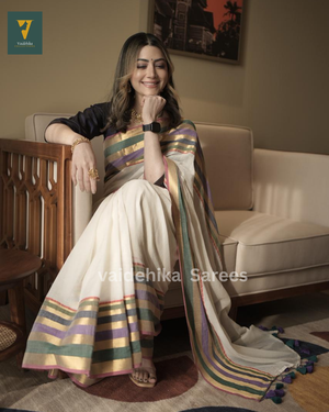 Embrace timeless elegance with this stunning mul cotton kasavu saree, a masterpiece of traditional craftsmanship. The pristine cream base is beautifully enhanced by a striking contrast-colored border that frames the entire drape with sophistication. Adorned with luxurious golden accents throughout, this saree radiates opulence and grace. The finishing touch comes from vibrant tassels in violet, green, and red—each hue adding a pop of color and movement to your ensemble. Perfect for festivals, celebrations, or special occasions, this kasavu saree seamlessly blends heritage with contemporary style, making you the center of attention wherever you go.