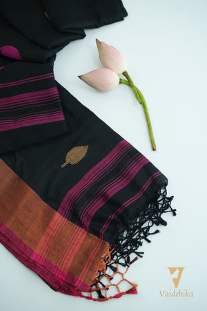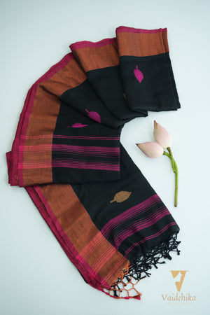 Elevate your elegance with the Aaradhya Black Saree, crafted from breathable khadi cotton for unmatched comfort and timeless style. Its rich black hue and subtle texture make it perfect for both casual and formal occasions, ensuring you stand out effortlessly. Experience the blend of tradition and modernity with this versatile saree that complements every mood and moment.