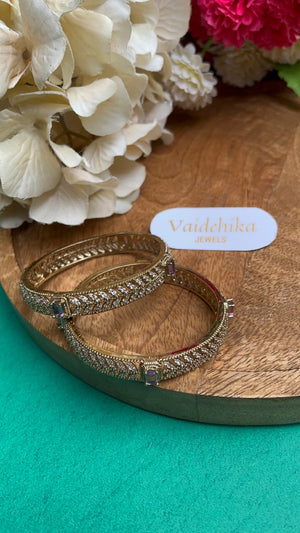 Add a sparkle to your ensemble with these exquisite American Diamond Bangles. Designed to catch the light beautifully, they offer a timeless charm that enhances any outfit. Perfect for special occasions or everyday elegance, these bangles bring a refined touch to your jewelry collection.