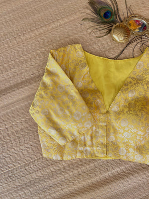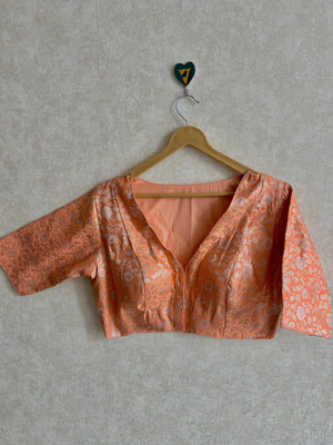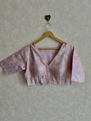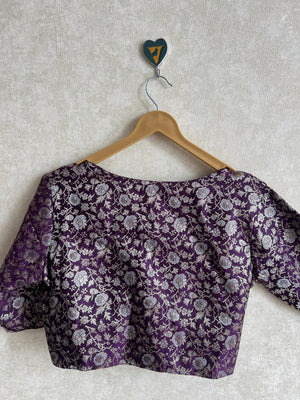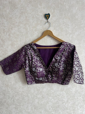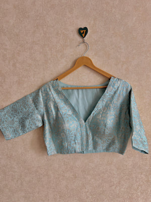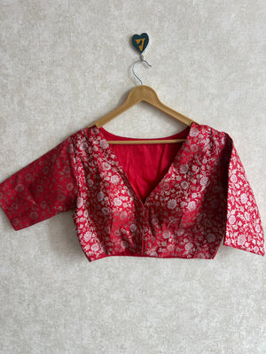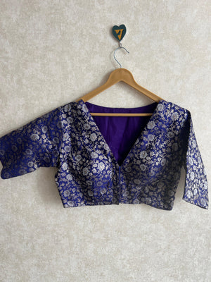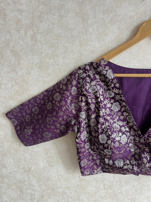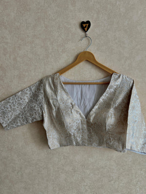 Elevate your traditional wardrobe with this Benarasi Brocade Blouse featuring exquisite silver zari work. Designed with elbow-length sleeves and a flattering V-neck, it offers a comfortable padded fit and adjustable sizing for a perfect silhouette. Ideal for Onam celebrations and festive occasions, this blouse combines classic craftsmanship with modern comfort.