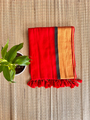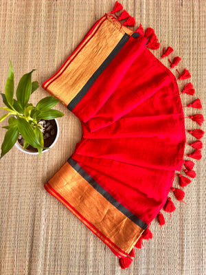 Crafted from soft mulcotton, this elegant piece features a delicate zari border complemented by a thin green edging, adding subtle contrast. Finished with vibrant red tassels, it brings a touch of tradition and charm to your wardrobe, perfect for graceful everyday wear or special occasions.
