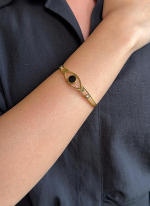 Elevate your everyday style with this stunning Eye Bangle, crafted to withstand the test of time. Featuring an intricate black enamel eye design at its center, this piece combines spiritual symbolism with contemporary elegance. The advanced anti-tarnish coating ensures your bangle maintains its lustrous finish for years, resisting discoloration and wear. Perfect for daily wear, it transitions seamlessly from casual to formal occasions without losing its vibrant appeal. Invest in a timeless accessory that stays as radiant as the day you first wore it.