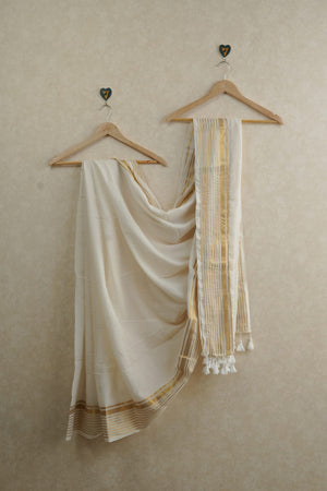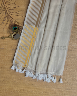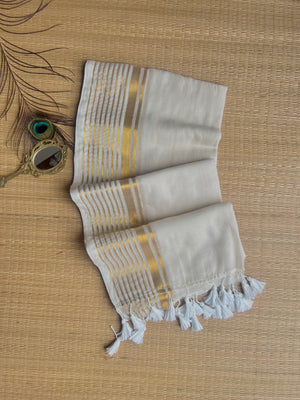 The Indhu Saree-VCM114 showcases exquisite white and gold handloom craftsmanship, blending traditional elegance with modern sophistication. Its delicate gold detailing enhances the pristine white fabric, making it an ideal choice for festive occasions and celebrations. Embrace the timeless beauty and artisanal quality of this saree to make a graceful statement wherever you go.