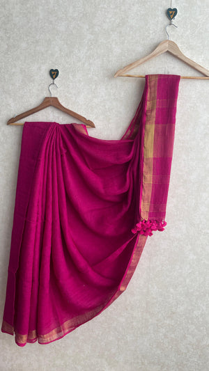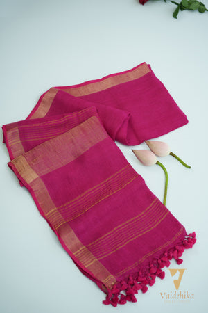 Elevate your wardrobe with the Jayasree Linen Pink Saree, featuring delicate tassels that add a graceful charm. Crafted from breathable linen, this saree promises comfort and elegance, perfect for both casual and festive occasions. Its soft pink hue enhances your natural glow, making every moment memorable. Embrace timeless style with this effortlessly beautiful piece.