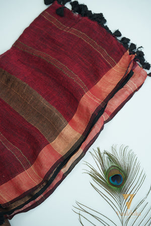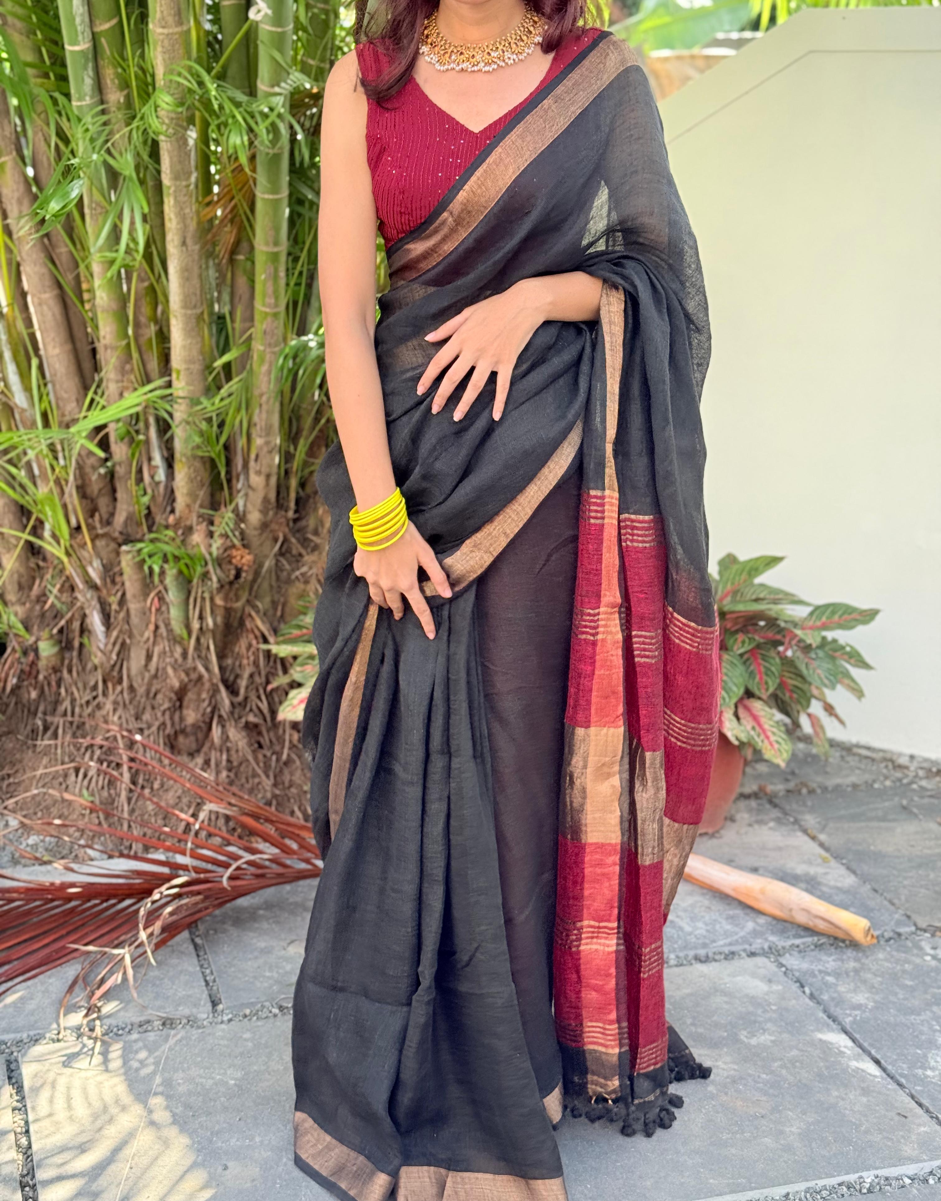 Experience elegance with this linen saree featuring a striking red and black combination. The golden zari border adds a touch of luxury, while black tassels enhance its graceful finish. Perfect for both festive occasions and formal gatherings, this saree brings comfort and style together effortlessly.