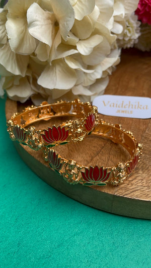 Embrace the elegance of tradition with these Lotus Bangles, featuring a beautifully detailed lotus motif that symbolizes purity and beauty. Perfect for enhancing your ethnic wardrobe, these bangles offer a comfortable fit and timeless style. Whether for festive celebrations or everyday grace, they add a refined touch that highlights your cultural roots with sophistication. Make these bangles your go-to accessory for a look that’s both classic and captivating.