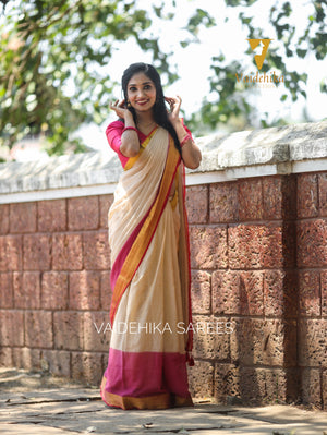 Elevate your wardrobe with the Meghana Pink Saree, a stunning handloom masterpiece that blends tradition with elegance. Its vibrant pink hue and intricate weaving make it perfect for festive occasions and celebrations. Crafted for comfort and style, this saree ensures you stand out with grace and charm. Embrace timeless beauty with Meghana.