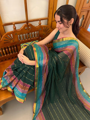 Mizhi 2.0 Saree-VCM397 brings timeless elegance with its luxurious mulcotton fabric, offering comfort and grace for every occasion. Adorable colorful tassels and vibrant lines create a playful charm, while the ornate golden zari border and hemline add sophisticated glamour. The intricate detailing transforms this saree into a statement piece that celebrates traditional craftsmanship with contemporary flair. Perfect for celebrations, festivals, or special moments, this saree effortlessly elevates your ethnic wardrobe with its stunning visual appeal and premium quality.