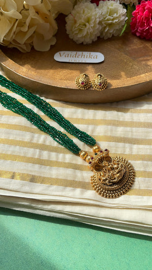 Embrace divine elegance with the Nagasree Lakshmi Necklace, a stunning piece inspired by sacred serpent symbolism. This exquisite necklace features intricate naga design work that captures the mystique and power of traditional craftsmanship. The set includes matching earrings, creating a complete, coordinated look that radiates spiritual grace and timeless beauty. Perfect for festivals, celebrations, or everyday wear, this collection brings prosperity and protection to your personal style. Crafted with meticulous attention to detail, each piece tells a story of heritage and devotion.