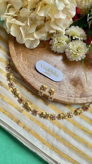 Discover the charm of the Pushpa Hathi-VJAD002, a trending neck piece and earrings set featuring an exquisite elephant design. Adorned with green and white stones, this elegant floral-inspired jewelry adds a unique cultural touch while enhancing your style. Choose between two captivating shades to complement any outfit, making it the perfect accessory to express your individuality with grace.