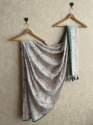 Discover the timeless elegance of the Pushpa Saree, crafted from pure mulcotton for unmatched comfort and breathability. This exquisite piece features delicate small flower motifs adorning the entire body, creating an understated yet sophisticated look. Choose from two stunning shades to match your personal style. Finished with coordinating tassels and a refined thin border, this saree effortlessly transitions from everyday wear to special occasions. Experience the perfect blend of traditional craftsmanship and contemporary design that celebrates your natural grace.