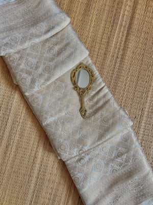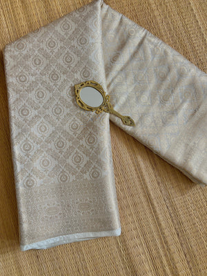 Elevate your elegance with this Semi Kattan Off White Benarasi Saree. Crafted with rich texture and subtle sheen, it offers timeless beauty perfect for special occasions. The off-white shade adds a graceful charm, while the intricate Benarasi weave ensures a luxurious drape that enhances your silhouette effortlessly. Ideal for celebrations, this saree blends tradition with sophistication to make you stand out with every wear.