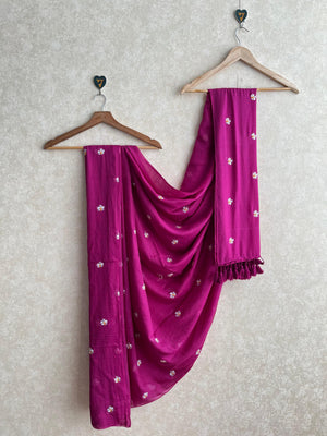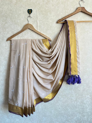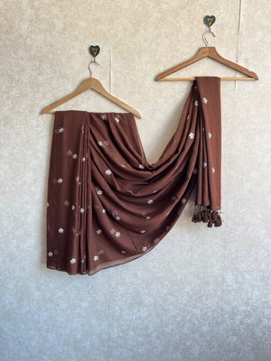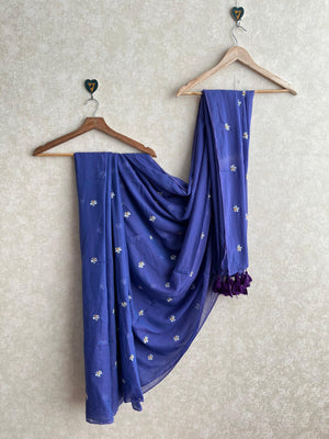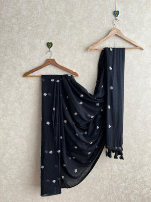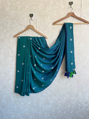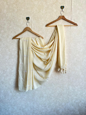 Elevate your ethnic wardrobe with the Shulee Saree, crafted from pure mulcotton for unmatched comfort and breathability. This exquisite piece features an intricate siuli flower embroidery design that captures timeless elegance. Available in multiple coordinated shades, each saree comes with matching tassels that perfectly complement the embroidery, creating a harmonious and sophisticated look. Perfect for celebrations, festivals, or everyday wear, this saree blends traditional artistry with premium quality fabric for a truly memorable drape.