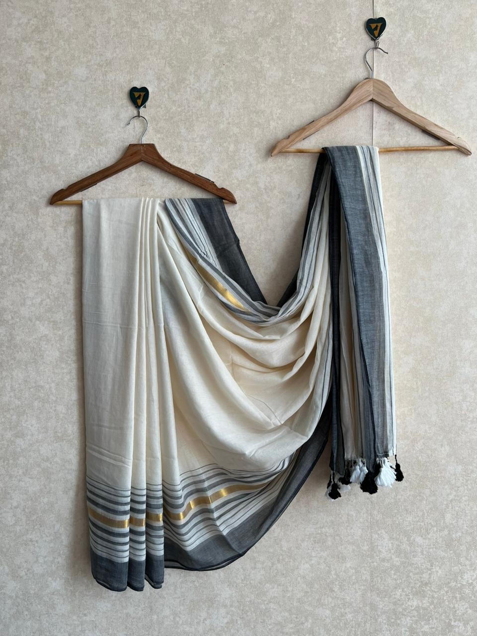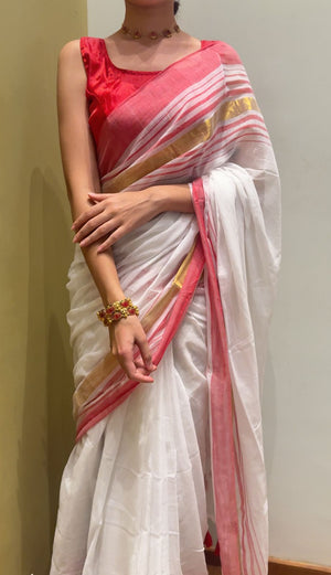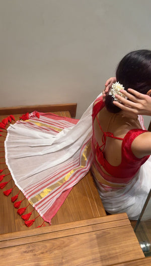 Celebrate tradition with the Shyama-VCM128 saree, featuring elegant red lines at the top and bottom, enhanced by golden zari detailing and delicate tassels. This saree blends classic charm with festive vibrance, making it perfect for Onam and special occasions. Its rich colors and intricate accents ensure you stand out with grace and style.