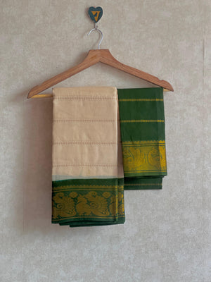 Discover the elegance of the Sungudi Veldhari saree crafted from 100 count special fabric, offering a luxurious feel and exceptional durability. Its contrast color border adds a vibrant touch, making it perfect for special occasions. This saree combines traditional artistry with premium quality, ensuring you stand out with grace and style.