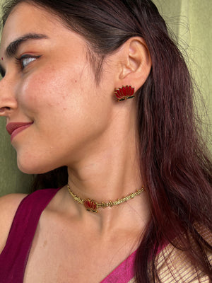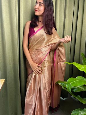 Elevate your ethnic wardrobe with this stunning golden tissue saree, beautifully adorned with a wine-colored border and matching dark wine tassels. This complete ensemble includes exquisite jewelry pieces designed to complement your look perfectly—a graceful lotus-inspired golden necklace, matching earrings, and an elegant lotus pendant. Each piece is crafted to enhance your natural beauty and add a touch of sophistication to any occasion. Whether you're attending a wedding, festival, or special celebration, this saree and jewelry combo transforms you into the center of attention. The luxurious tissue fabric drapes elegantly while the rich wine accents create a striking contrast that flatters every complexion. Invest in timeless elegance that celebrates traditional craftsmanship with contemporary style.