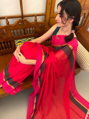 Experience timeless elegance with this exquisite mull cotton saree combo that brings together tradition and contemporary style. The soft pink saree showcases a bold dark green border framed by delicate golden double-line accents, while dark pink tassels add a luxurious finishing touch. This complete ensemble includes the sophisticated Trishika invisible chain and matching earrings—thoughtfully curated to complement every angle of your look. The breathable mull cotton fabric ensures all-day comfort, making it ideal for weddings, festivals, and celebrations. Whether you're seeking a polished ethnic appearance or a statement piece that reflects your refined taste, this combo delivers everything you need in one beautifully coordinated package. Invest in versatility without the styling stress.