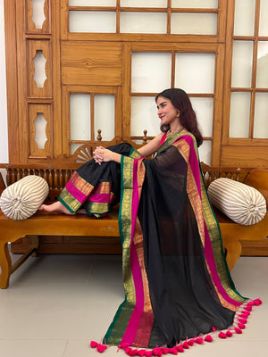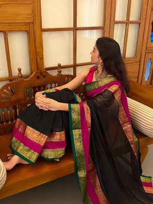 Elevate your traditional look with this exquisite mul cotton saree and jewelry combo. The saree features a striking pink and green border that adds vibrant dimension to its soft, breathable fabric—perfect for all-day comfort during festivals and special occasions. Paired with authentic temple-inspired jewelry including matching earrings, this complete ensemble eliminates the styling guesswork. The intricate temple jewelry design complements the saree's classic aesthetic while adding a touch of cultural richness. This thoughtfully curated combo offers exceptional value, allowing you to step out with confidence in a coordinated, polished look that celebrates tradition with effortless grace.